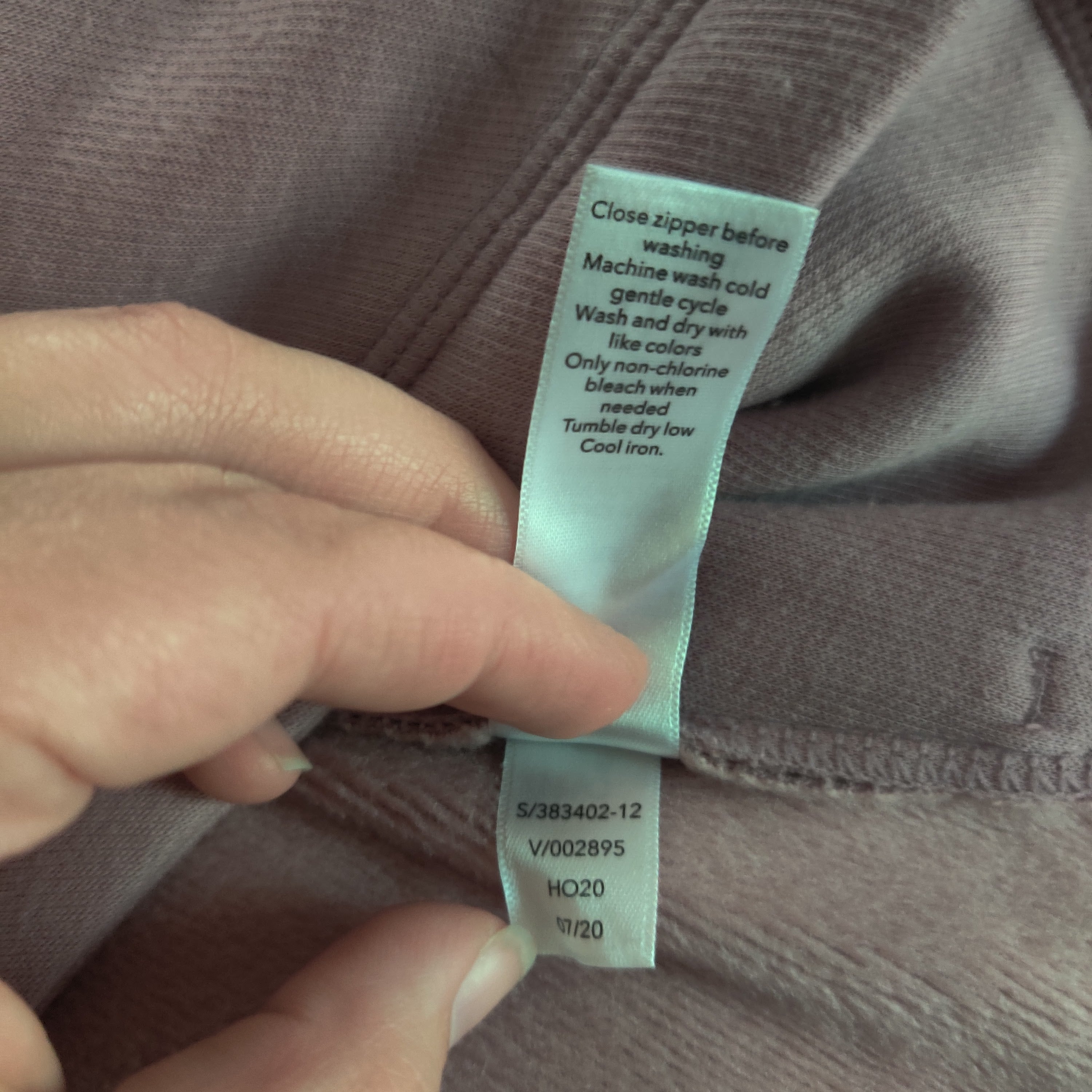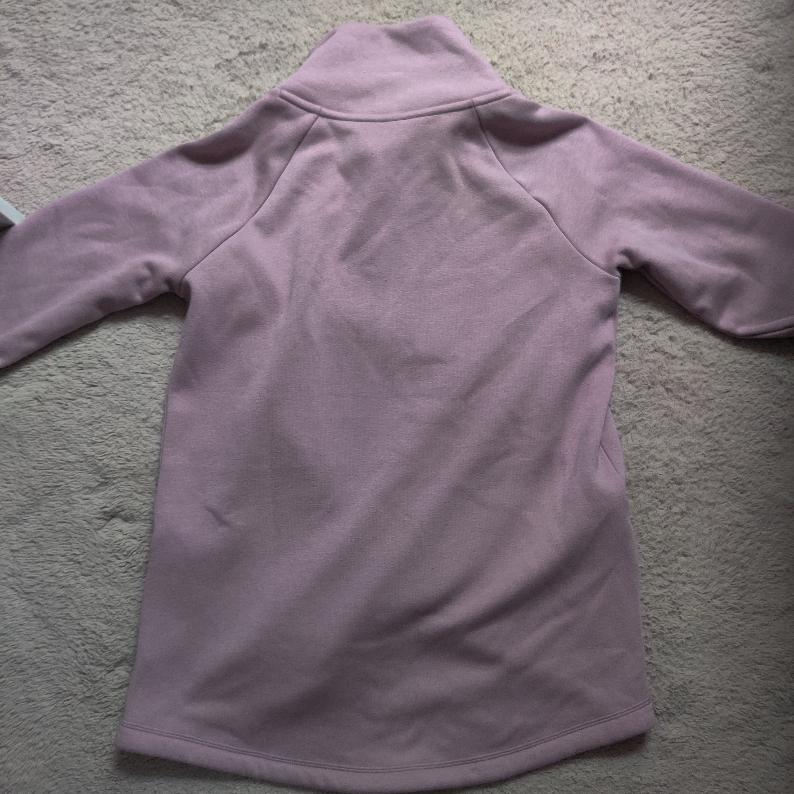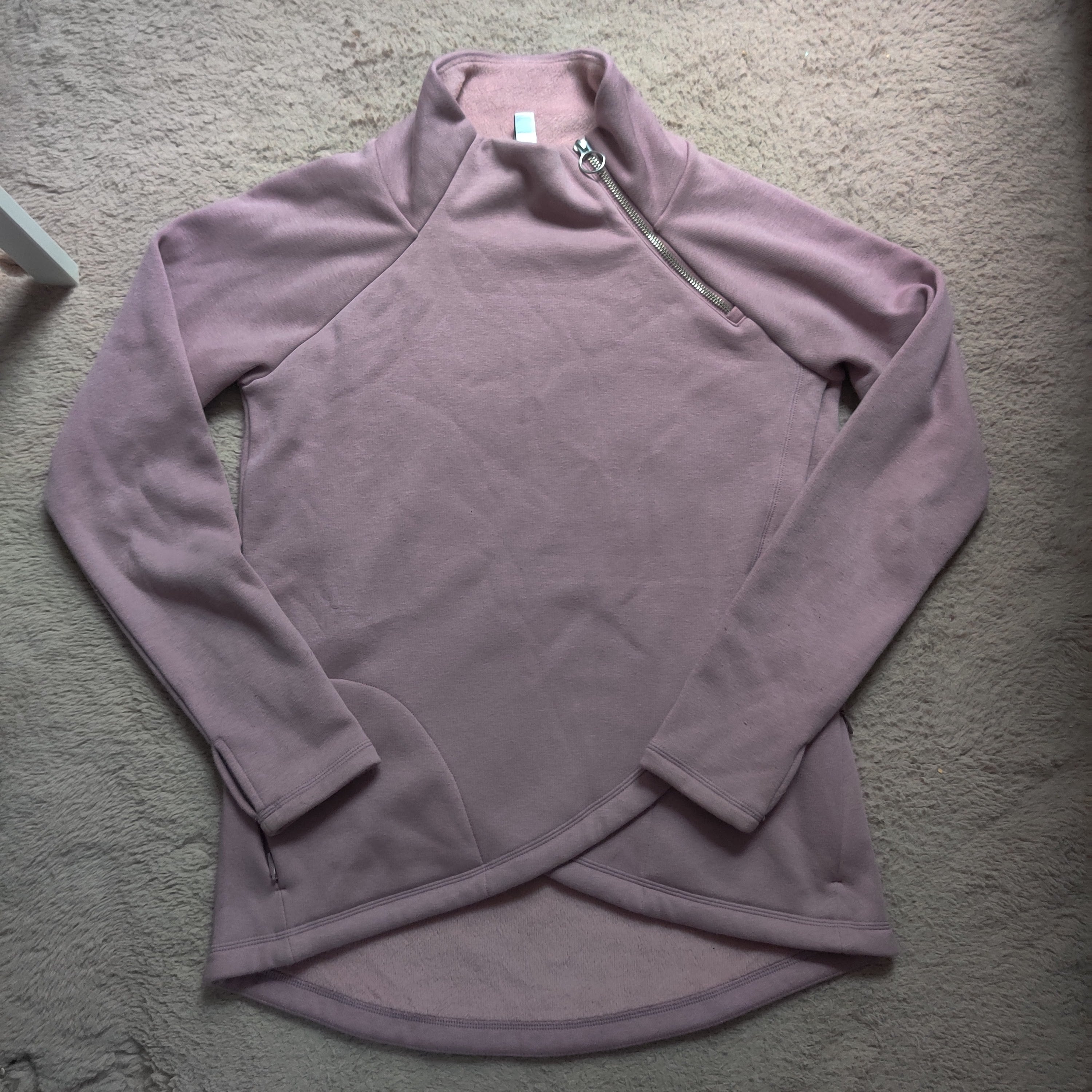 Sweatshirt is a beautiful light purple color and is so comfy with the fuzzy fleece lining. Sweatshirt has zipper pockets, a high neckline and a 1/4 zip with a ring shaped silver toned pull. Sweatshirt is made of two overlapping layers giving it a fun asymmetrical hemline.