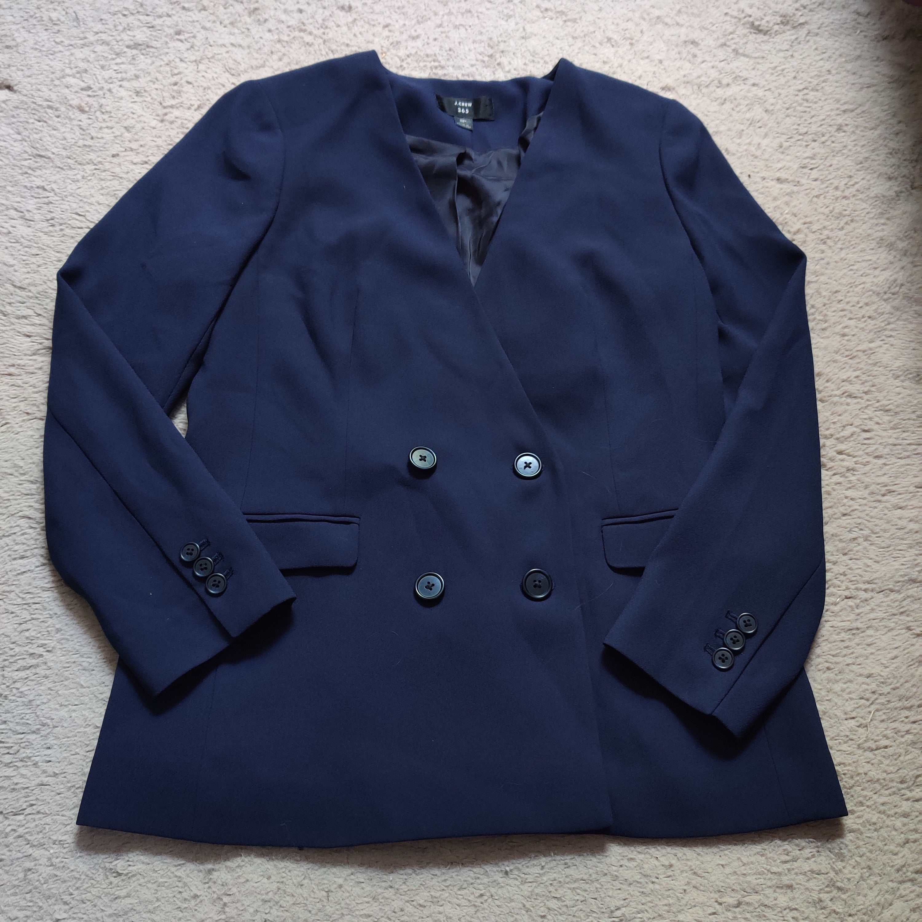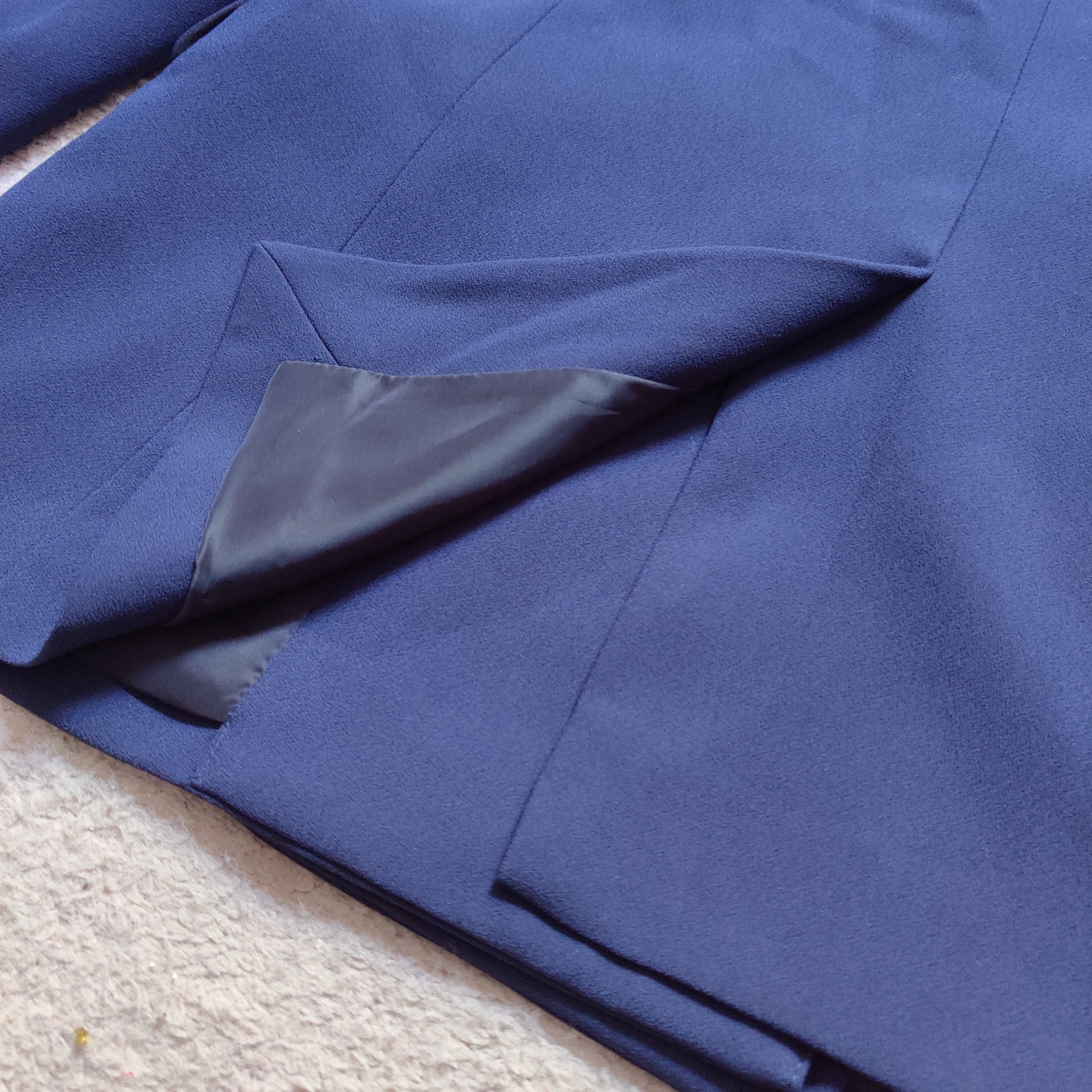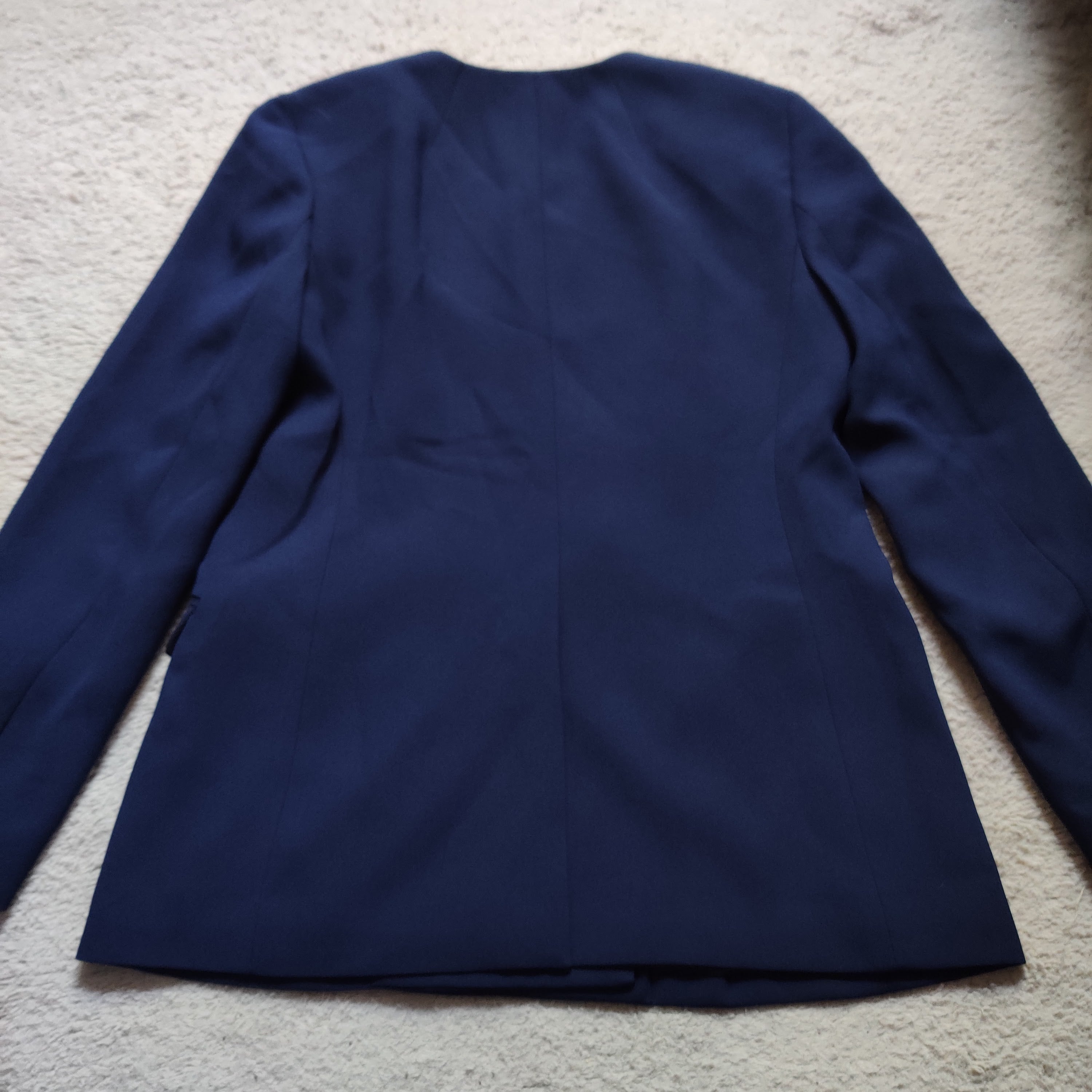 Jacket is in like new condition with no flaws or signs of wear. Jacket is made of a beautiful navy blue crepe fabric. Jacket has no collar, is double breasted, has external pockets, and a vent in the back. Perfect for so many occasions