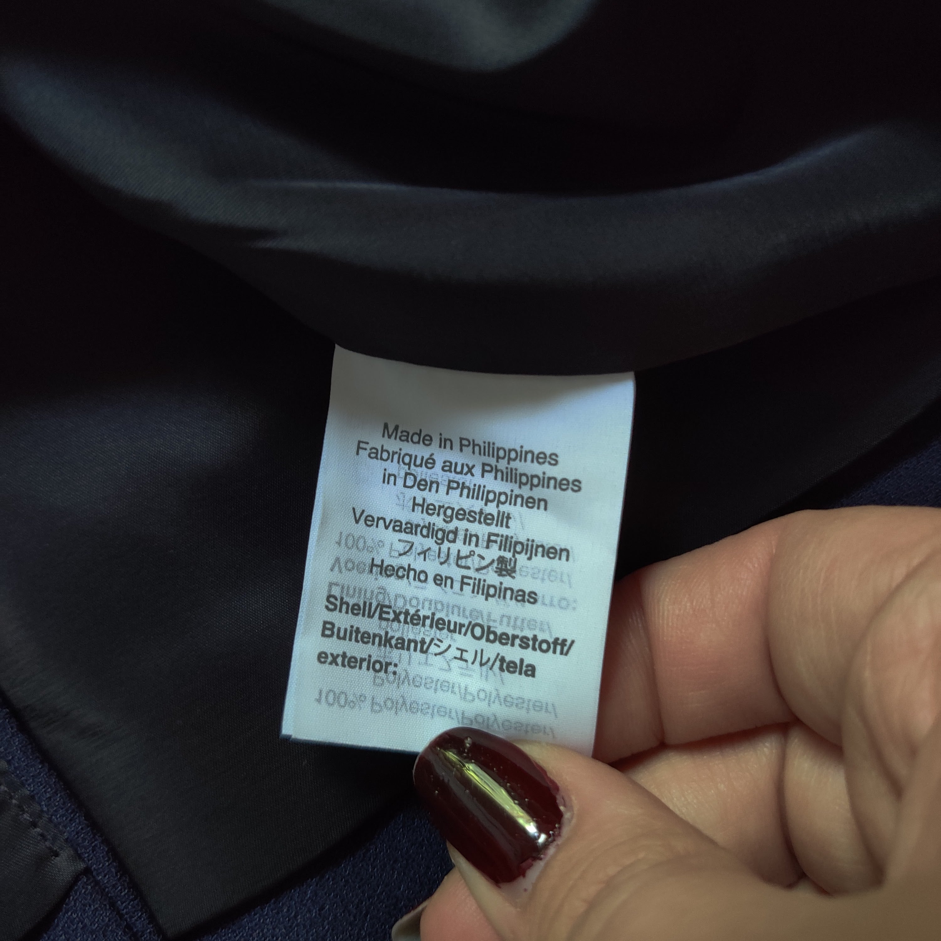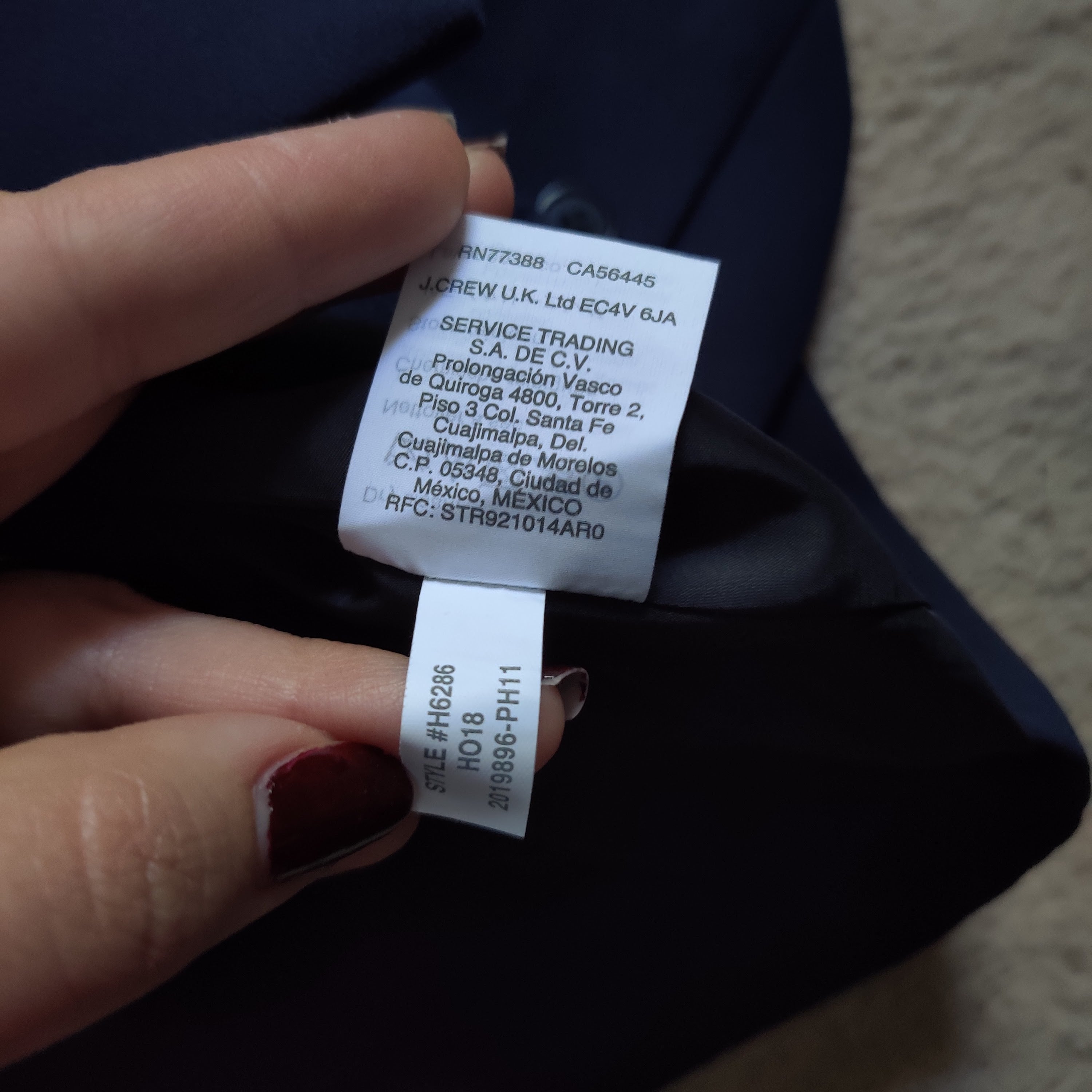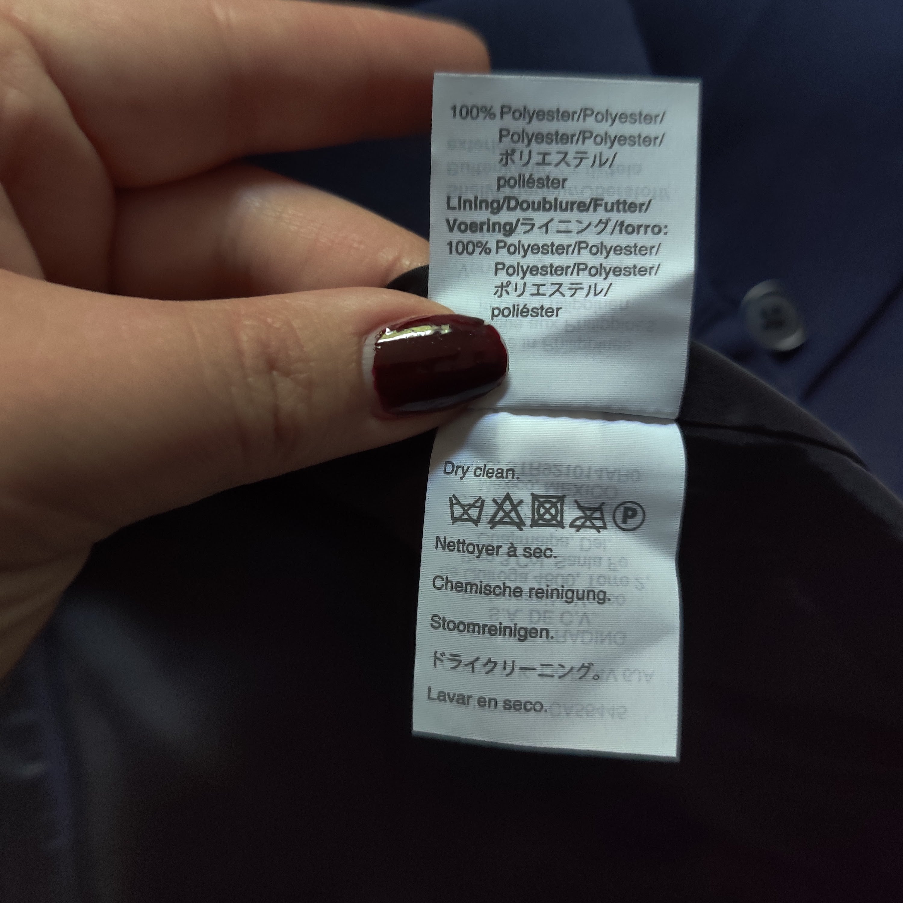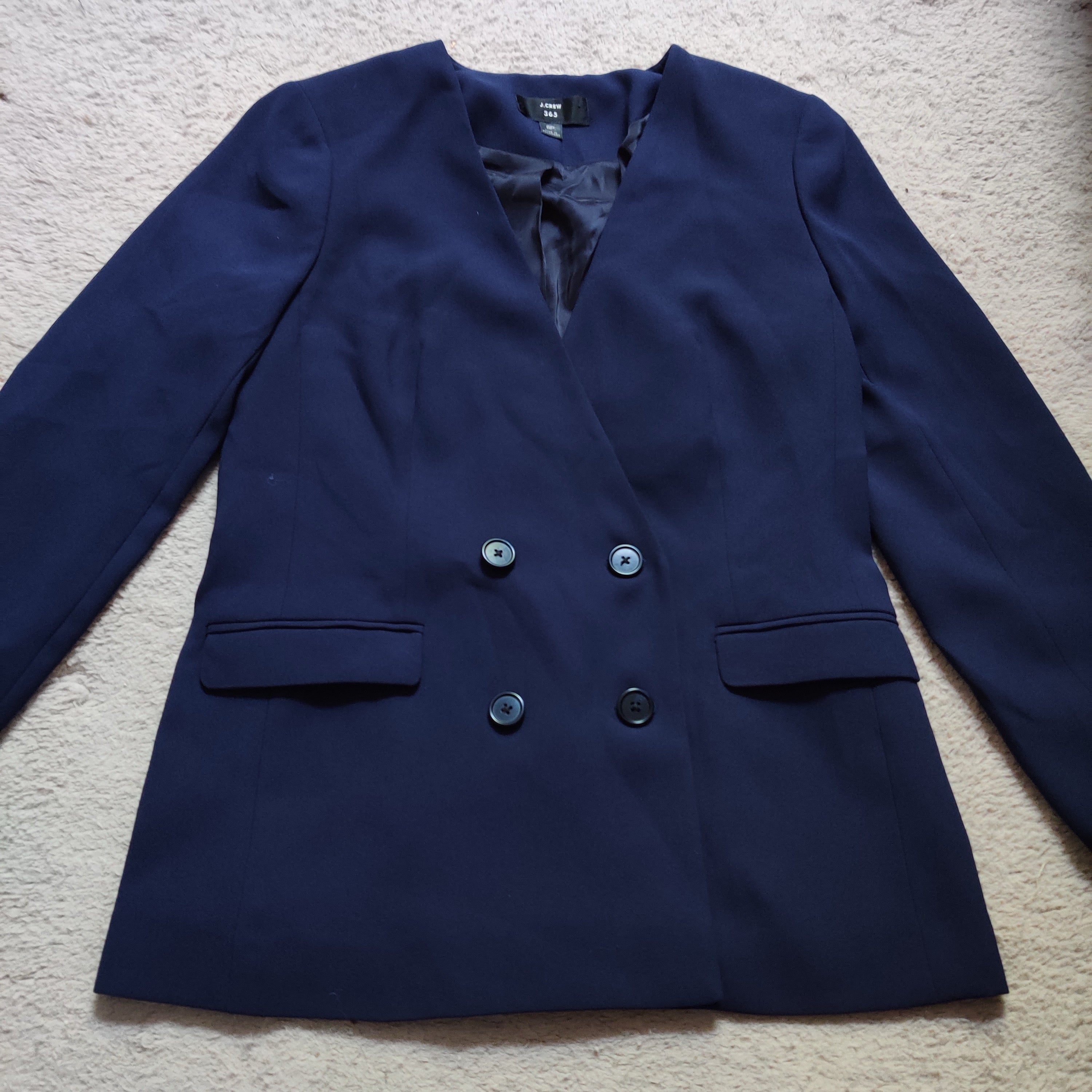 Jacket is in like new condition with no flaws or signs of wear. Jacket is made of a beautiful navy blue crepe fabric. Jacket has no collar, is double breasted, has external pockets, and a vent in the back. Perfect for so many occasions