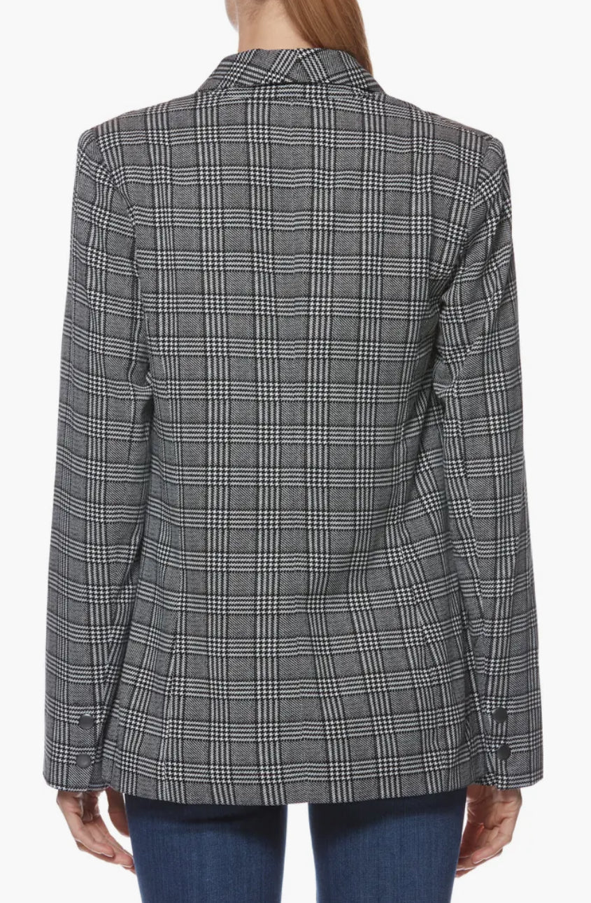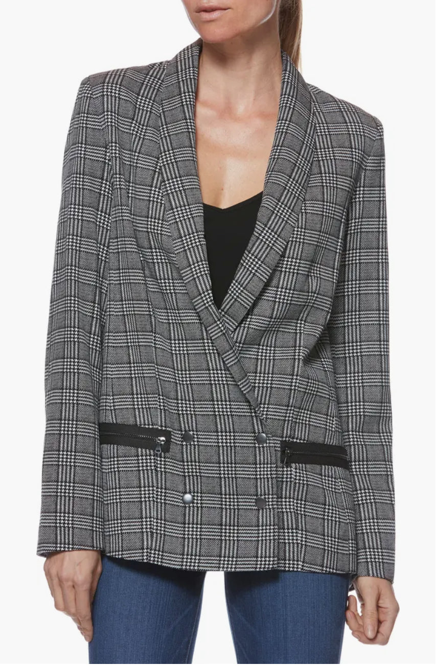 Polish up in this silky-smooth unstructured blazer styled with houndstooth checks, exposed zips and double-breasted snaps.
