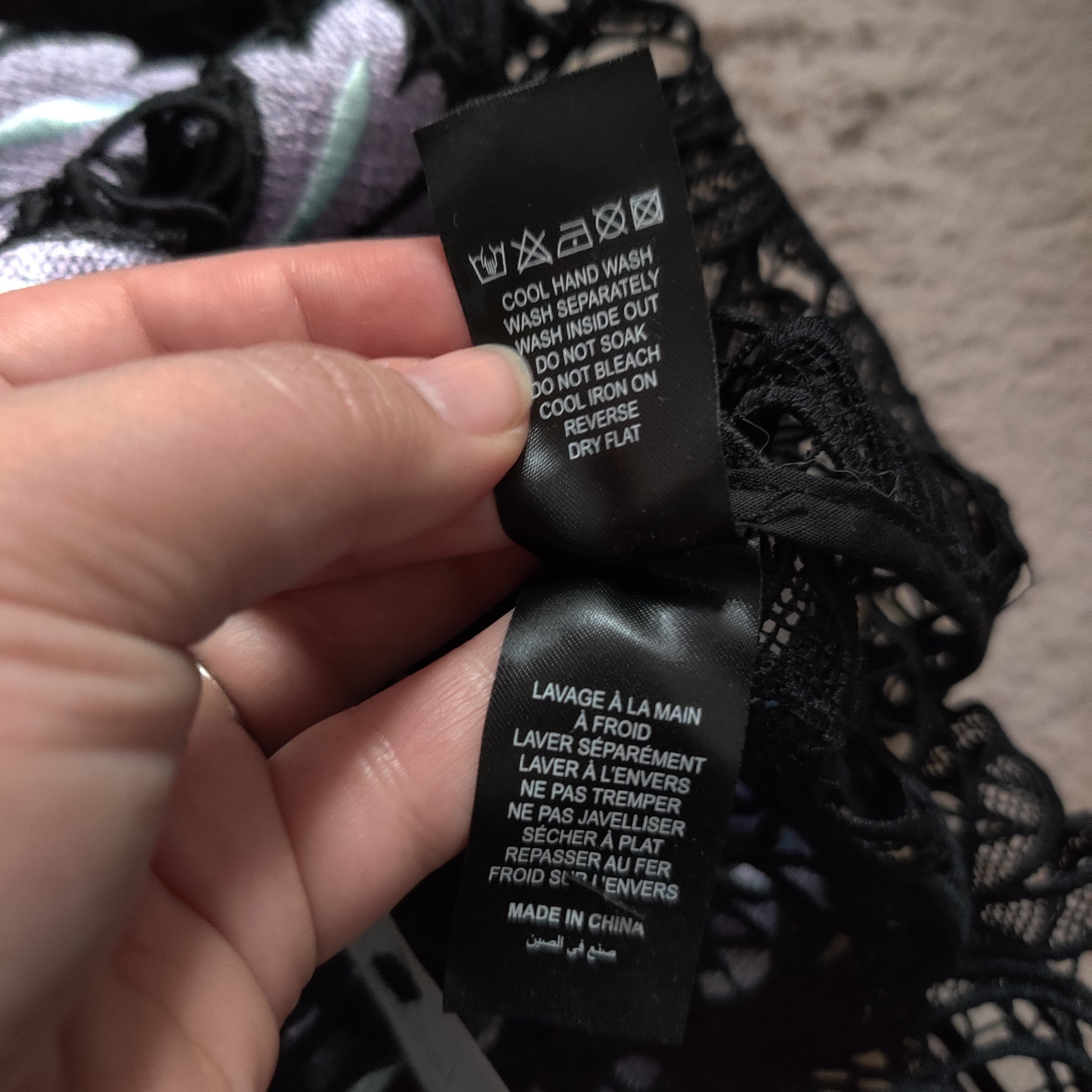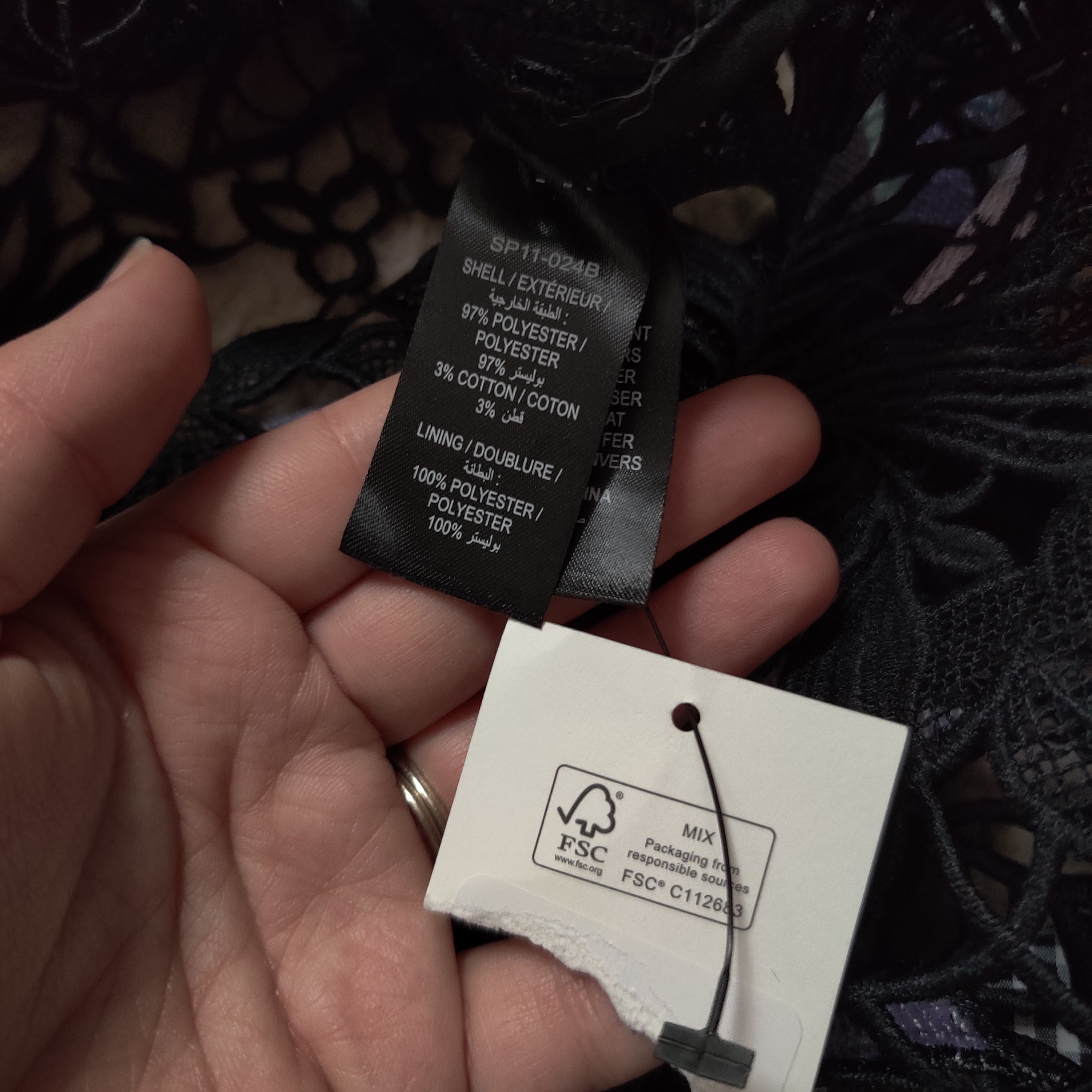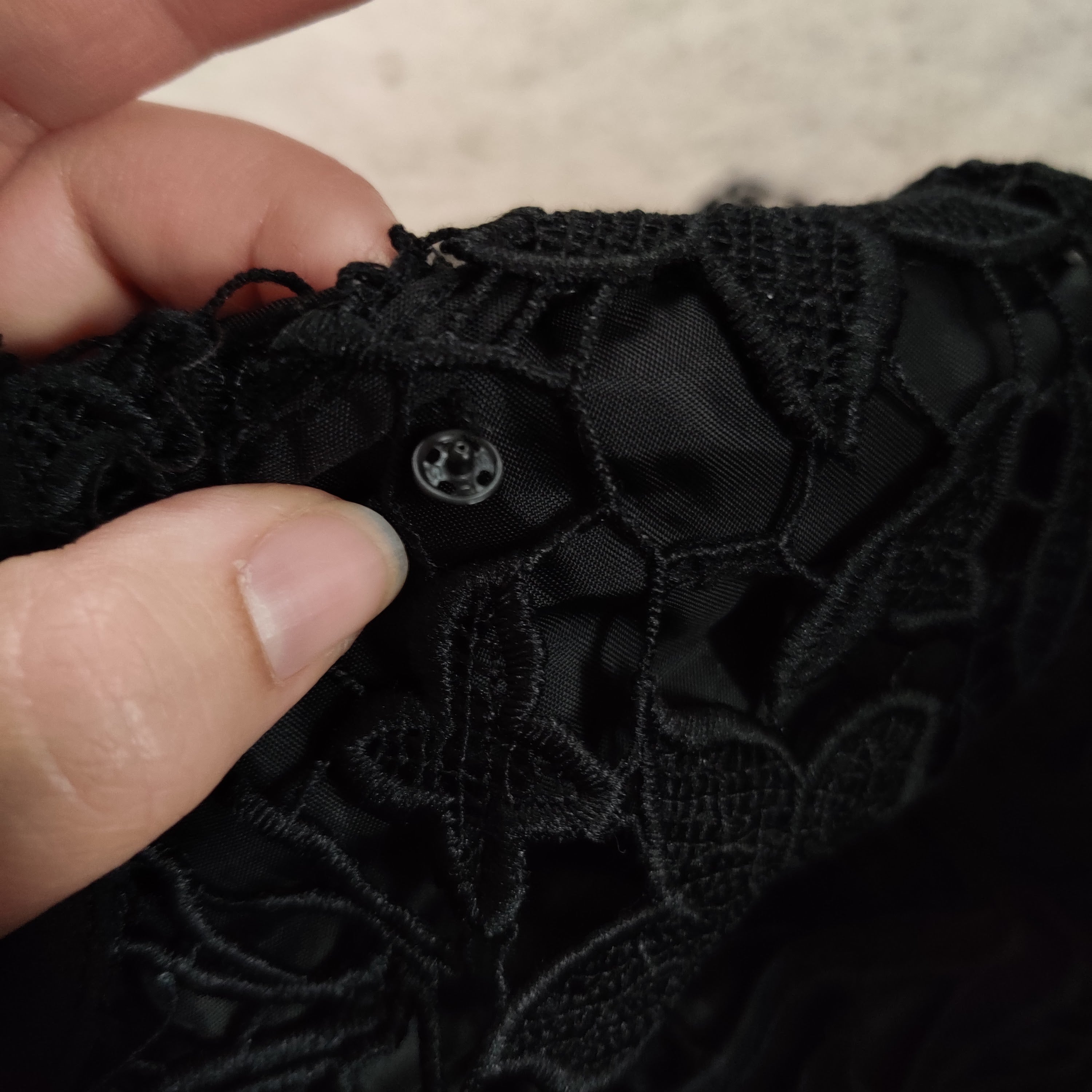 Dress was altered. Original pale blue spaghetti strap lining was removed and replaced with a full black lining that leaves the entire dress opaque. Dress still has part of the tag attached, and appears to never have been worn. One of the hanger straps was not removed and can be seen through the guipure lace between the lace and the lining. There is also a snap that was never removed as pictured. Neither of these is noticeable when wearing and both could easily be removed. DOES NOT COME WITH ORIGINAL LINING
