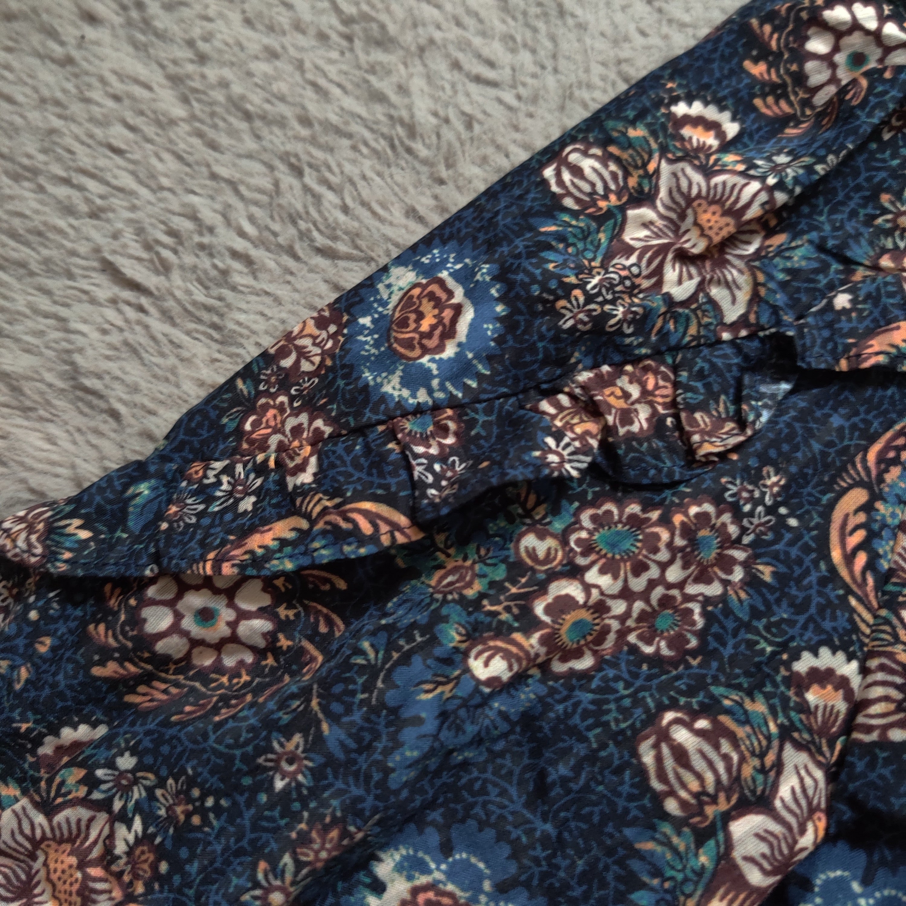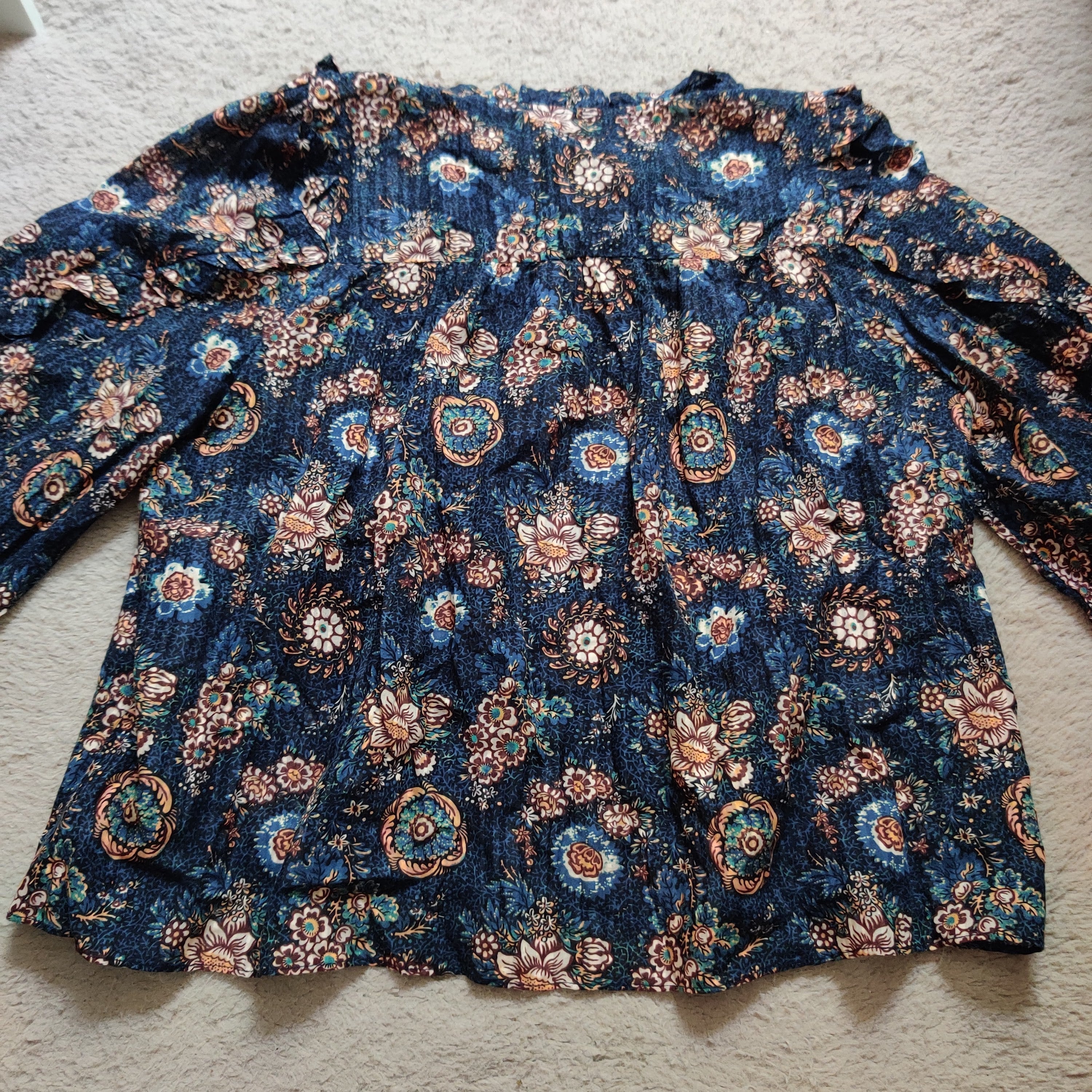 Like new condition with no flaws. Pattern is a lovely navy blue with blue, orange, cream, and teal florals.